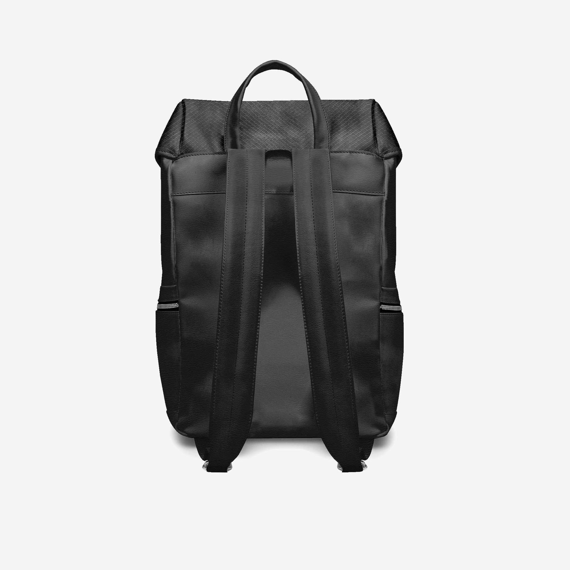 This backpack features a sleek, contemporary design with three external zippered pockets, accented by two prominent buckles. The logo is embedded within twin rectangular embellishments.