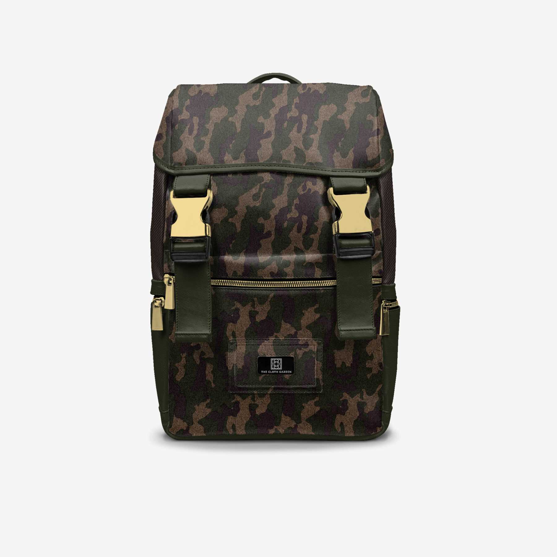 This backpack features a sleek, contemporary design with three external zippered pockets, accented by two prominent buckles. The logo is embedded within twin rectangular embellishments.