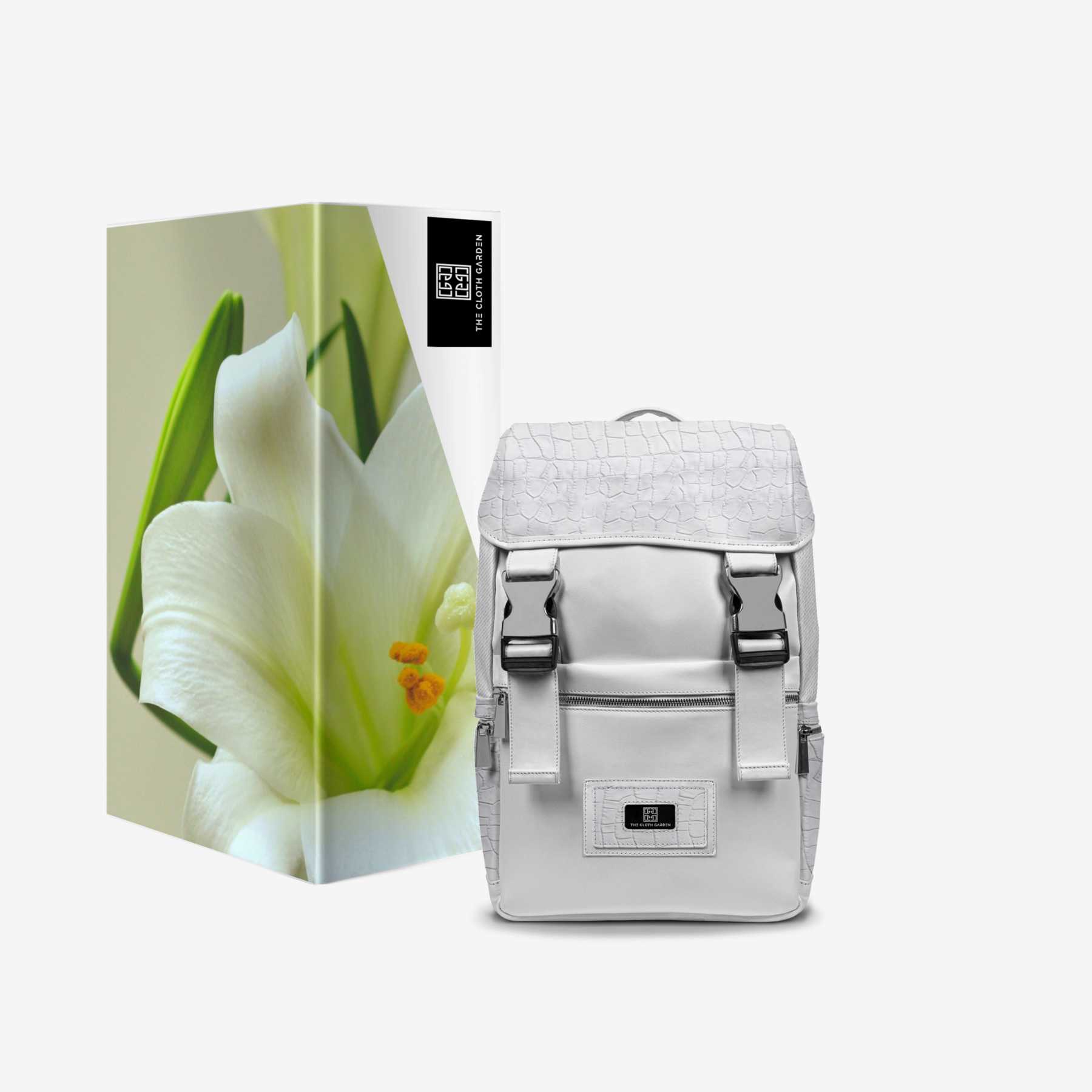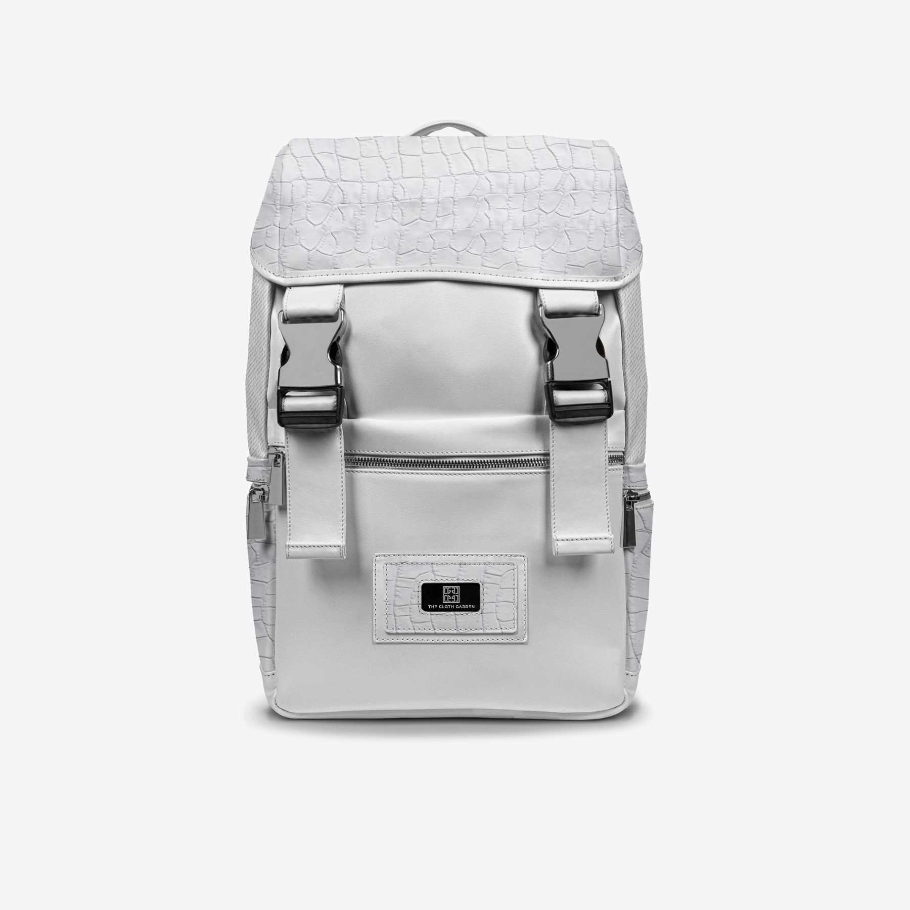 This backpack features a sleek, contemporary design with three external zippered pockets, accented by two prominent buckles. The logo is embedded within twin rectangular embellishments.